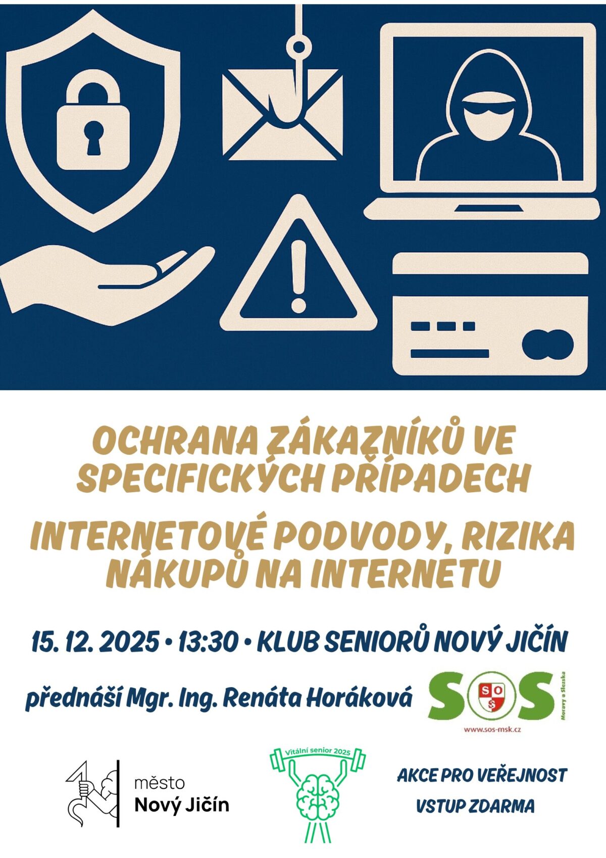 Přednáška se uskuteční v pondělí 15. prosince 2025 od 13:30 hodin v Klubu seniorů Nový Jičín na Msgr. Šrámka. Téma: – ochrana zákazníků ve specifických případech – internetové podvody, rizika nákupů na internetu Přednáška je zdarma, určena široké veřejnosti.