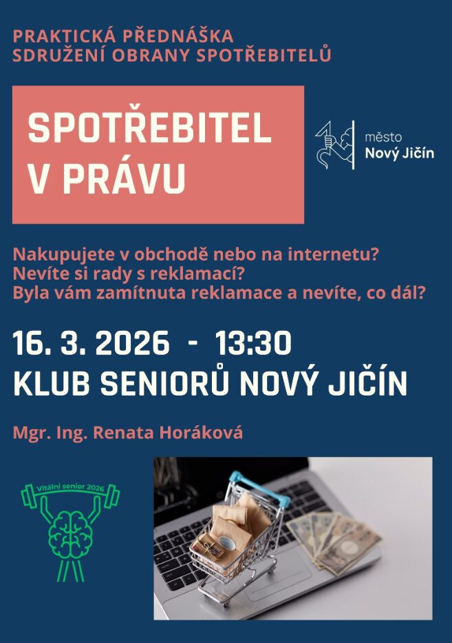 Město Nový Jičín si Vás dovoluje pozvat na přednášku Sdružení obrany spotřebitelů na téma Spotřebitel v právu. Akce proběhne v pondělí 16. března 2026 od 13:30 h v prostorách klubu seniorů na Msgr. Šrámka 13 a je určena široké veřejnosti. Vstup je zdarma.