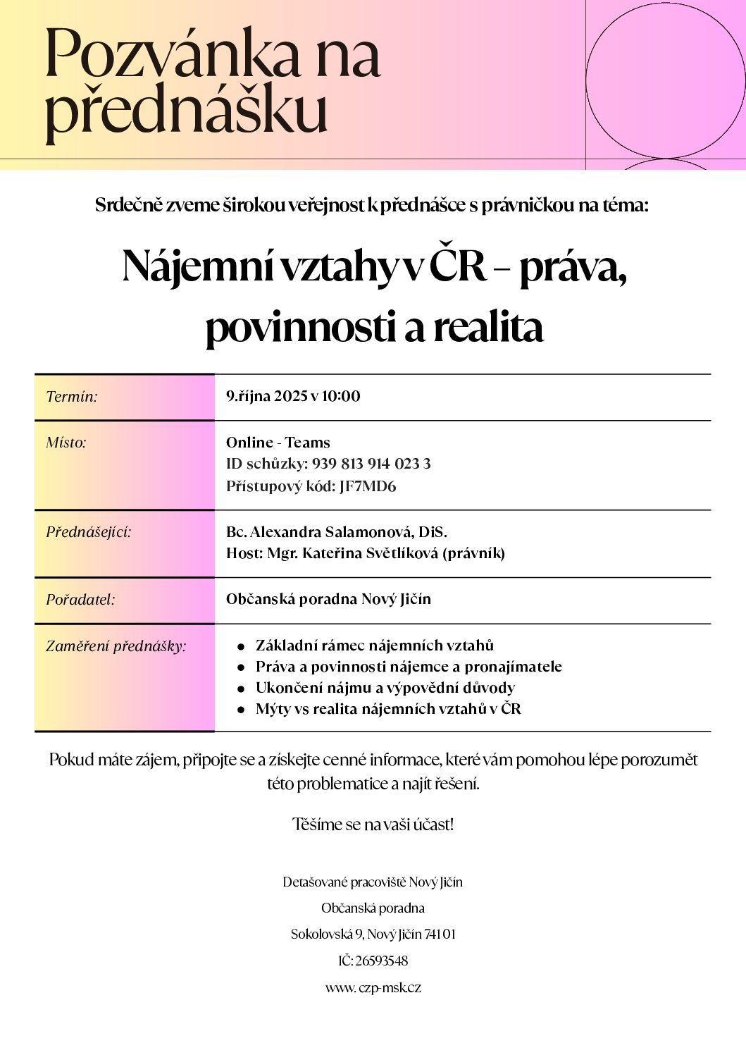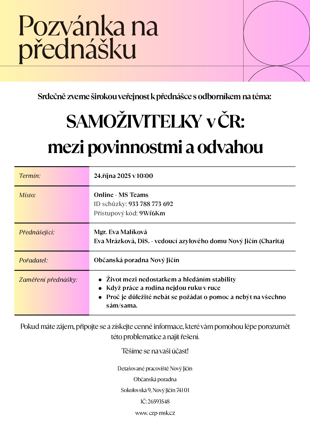 📅 Kdy: pátek 24. října 2025 od 10:00💻 Kde: online prostřednictvím MS Teams 🆔 ID schůzky: 933 788 773 692🔐 Přístupový kód: 9Wf6Km 🎙️ Přednášející:Mgr. Eva MalíkováEva Mrázková, DiS. – vedoucí Azylového domu Nový Jičín (Charita) 👥 Pořadatel: Občanská poradna Nový Jičín🕐 Délka přednášky: cca 45 minut + prostor pro dotazy💻 Forma: online přes MS […]