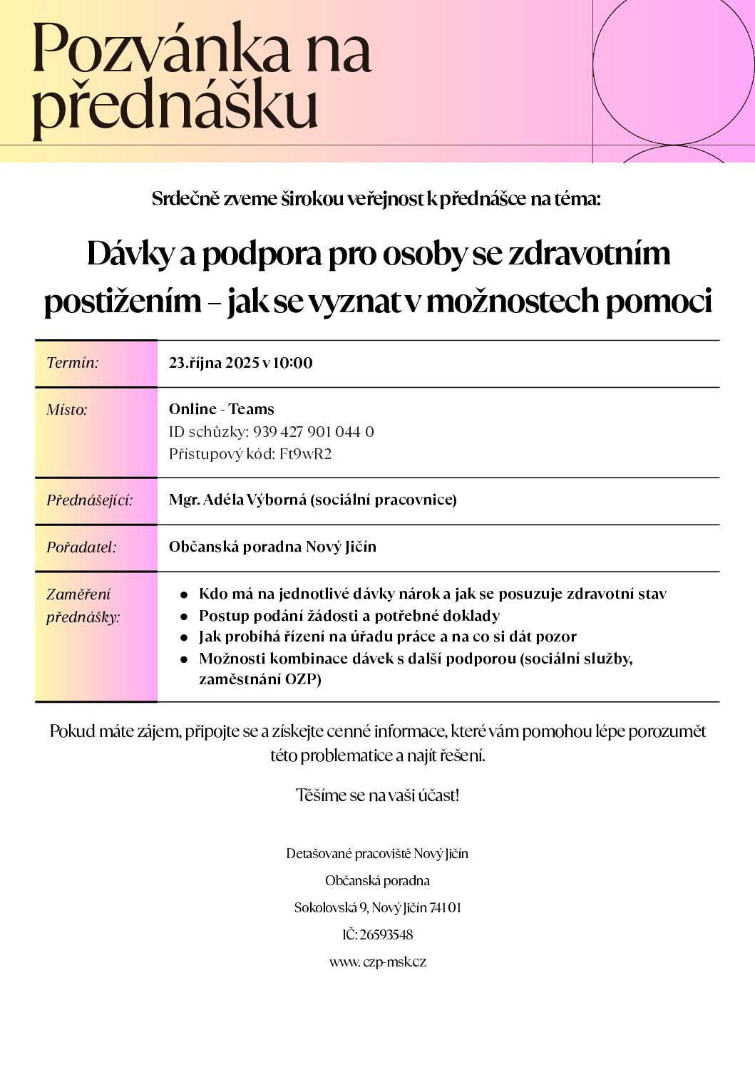 Pozvánka na přednášku „Dávky a podpora pro osoby se zdravotním postižením – jak se vyznat v možnostech pomoci“
