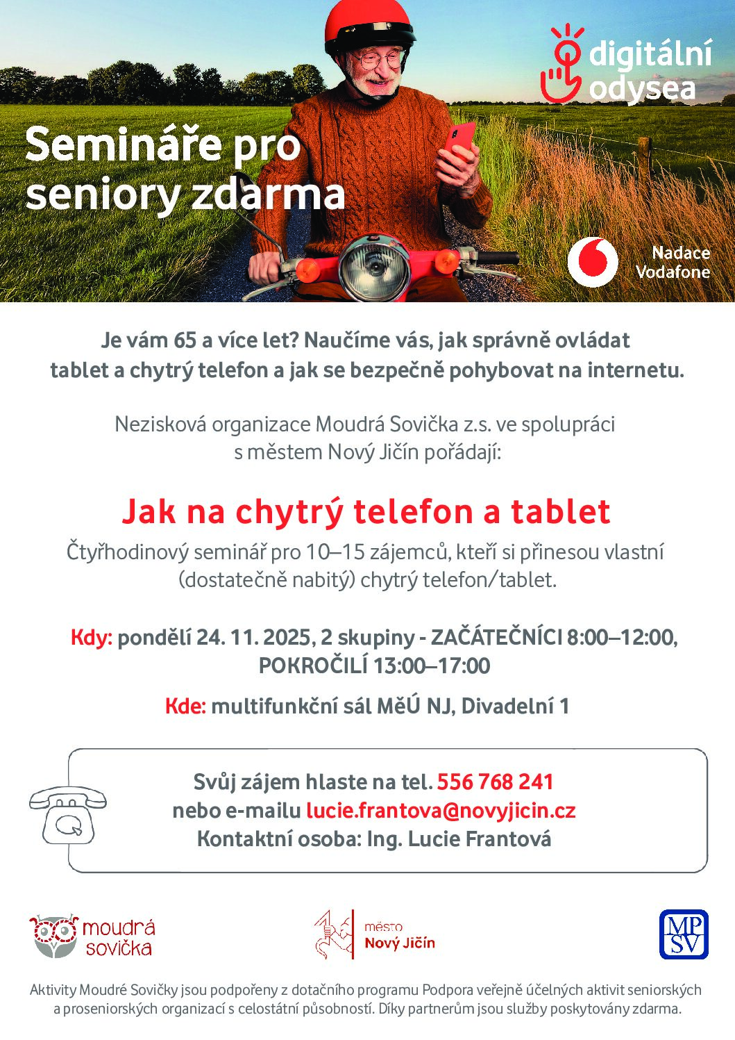 Chcete se naučit správně ovládat svůj chytrý telefon nebo tablet? Nebo se potřebujete jen zdokonalit? A je vám více než 65 let? Pak se přihlaste na bezplatný seminář, který proběhne v pondělí 24.11.2025.