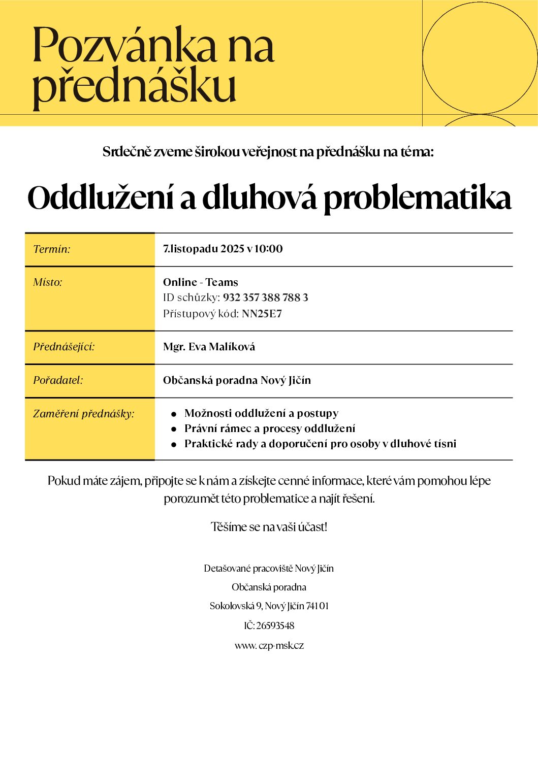 📅 Kdy: pátek 7. listopadu 2025 od 10:00💻 Kde: online prostřednictvím MS Teams🆔 ID schůzky: 932 357 388 788 3🔐 Přístupový kód: NN25E7 https://teams.live.com/meet/9323573887883?p=t5pYXDauIatzU0FIM4 🎙️ Přednášející:Mgr. Eva Malíková 👥 Pořadatel: Občanská poradna Nový Jičín🕐 Délka přednášky: cca 45 minut + prostor pro dotazy💻 Forma: online přes MS Teams 🔹 Zaměření přednášky: Možnosti oddlužení a postupy […]